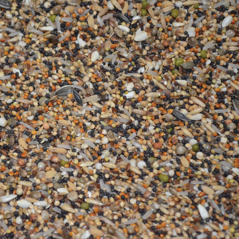 Composition: Red milocorn, white dari, oat kernels, paddy rice, raw rice, white cardoon seed, striped sunflower seeds, flaxseed, germinable turnip rape, rapeseed, hemp seed, silver/red/plata millet, canary seed, mung beans, wild seeds, sesame seeds